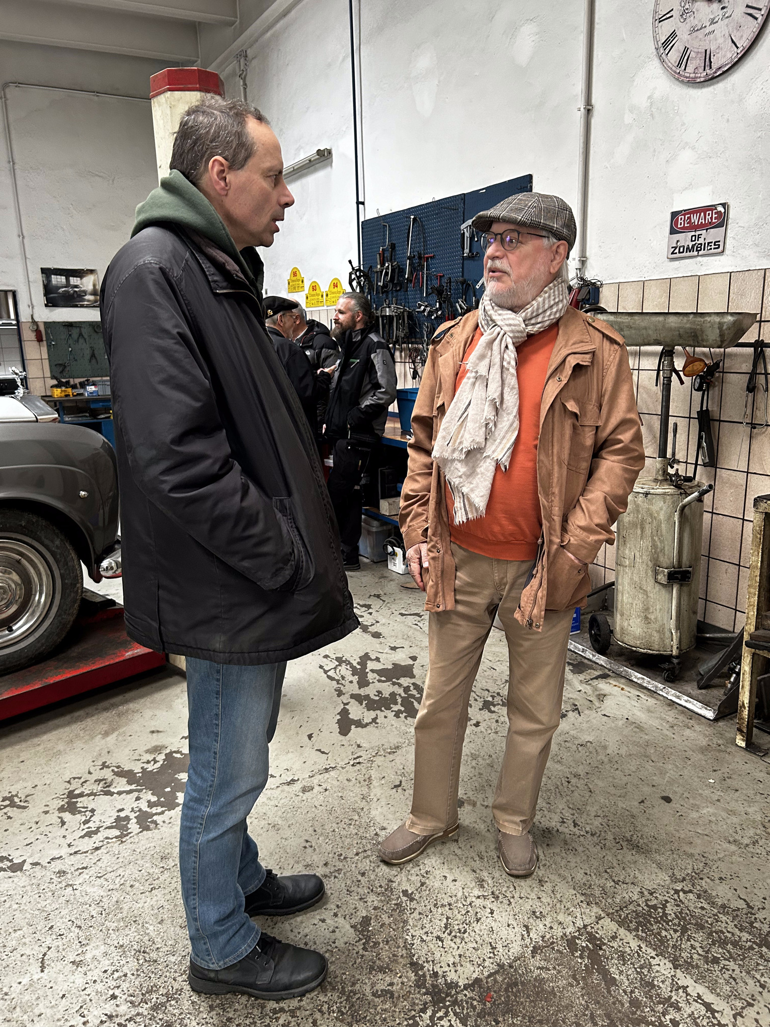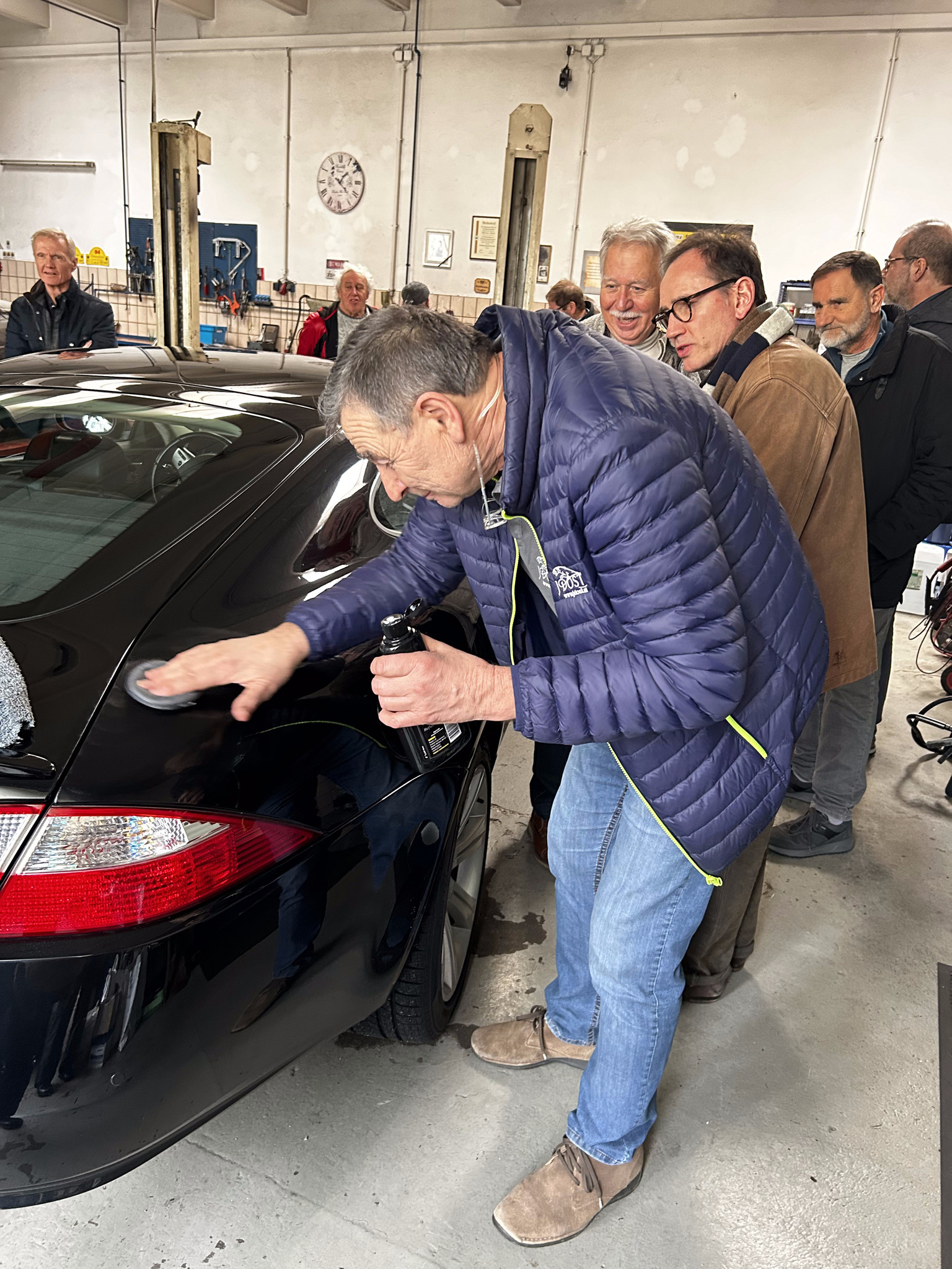 Treffpunkt ab 09.30 Uhr und um ca. 10 Uhr begann der Workshop mit dem obligatorischen Gruppenfoto – inkl Beachflags. Andi begrüßte die Teilnehmer und übergab das Wort an Stefan Deutsch, der uns durch den Workshop begleitete. Michael’s Jaguar XK Coupé durfte als Demonstrationsobjekt herhalten.