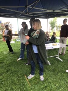 Um 9 Uhr begann das Event bei feuchtem, kühlen und etwas windigen Wetter mit einem vielfältigen Frühstücksbuffet im Zelt des Gastgartens des Wirtshauses – unterhalb der genüsslich grasenden Schafe. Heinz richtete ein paar Worte zur Organisation an die Anwesenden. Mit prall gefüllten Bäuchen bewegten sich die Teilnehmer – Heinz montierte zwischenzeitlich die Turnier-Dartscheiben an der Wand des Schuppens – gegen 11 Uhr unter das große Partyzelt. Nach einer kurzen Einführung in die Spielregeln und der Einteilung in zwei Gruppen konnte das Spiel beginnen.