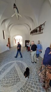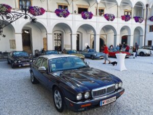 Der X-Type blieb auf der BratlAlm und wartete dort geduldig auf die Gelben Engel, die Passagiere allerdings bekamen Asyl in einem alt ehrwürdigem S-Typeund konnten somit weiter an der Ausfahrt teilnehmen. Die ca. 50km der 3. Etappe führten uns dann über wunderbar verschlungene Wege zum Schloss Herberstein. Welch eine Ehre! Wir durften unsere vierrädrigen Engländer im Hof des Schlosses rasten lassen, während wir zu Fuß einer wirklich interessanten Führung durch die Ausstellungen im Schloss folgten. Zurück aus dem Inneren des Schlosses labten wir uns beim Sektempfang im Hof direkt bei unseren Fahrzeugen. Nachdem ein paar von uns auch noch den sehenswerten Schlossgarten bestaunt hatten ging es zur 4. und letzten Etappe des Tages. Über Buchberg, Floing und Pöllau fuhren wir über wunderschöne Straßen wieder zurück zum Hotel Kutschenwirt nach Vorau. Gerade noch rechtzeitig, bevor der Himmel zu weinen begann, konnten wir unsere englischen Fahrzeuge auf den für uns reservierten Parkplatz abstellen.